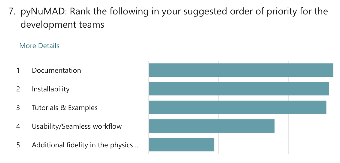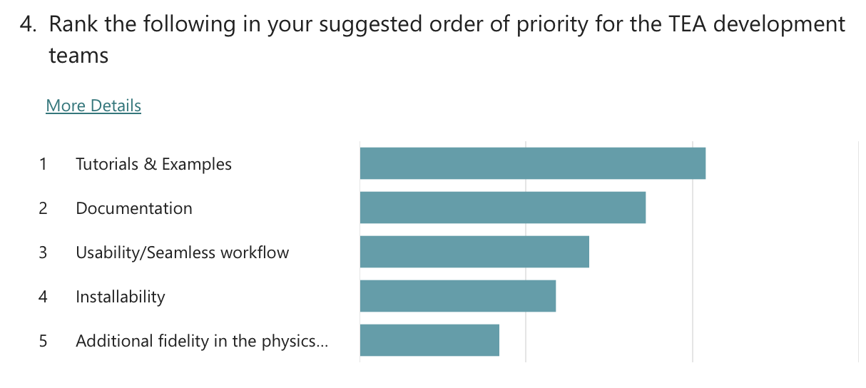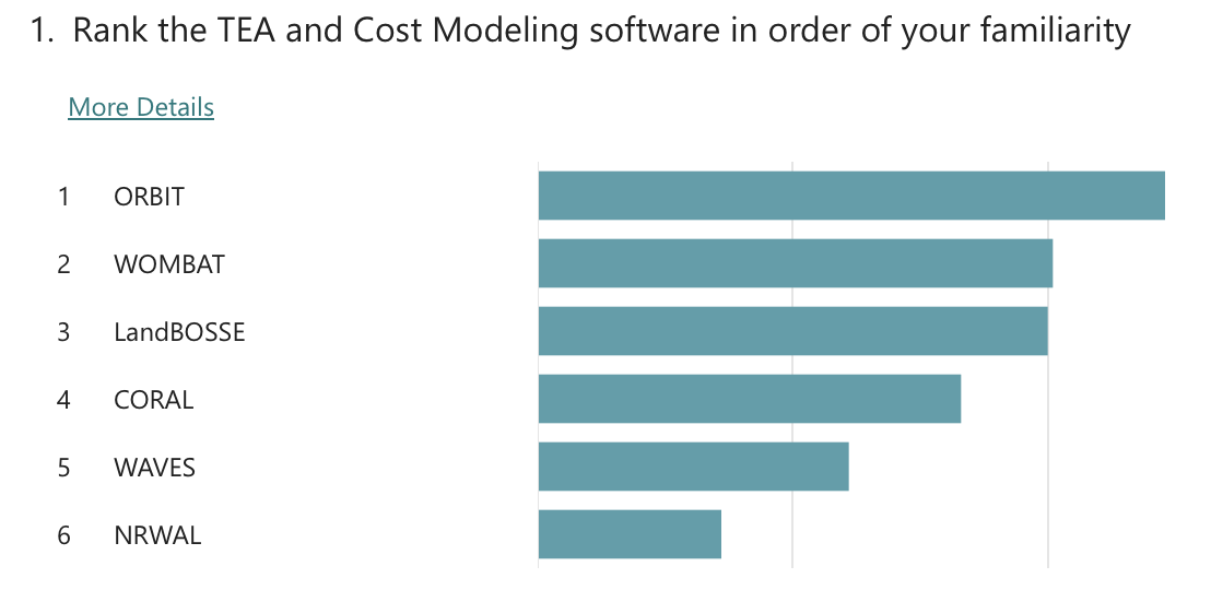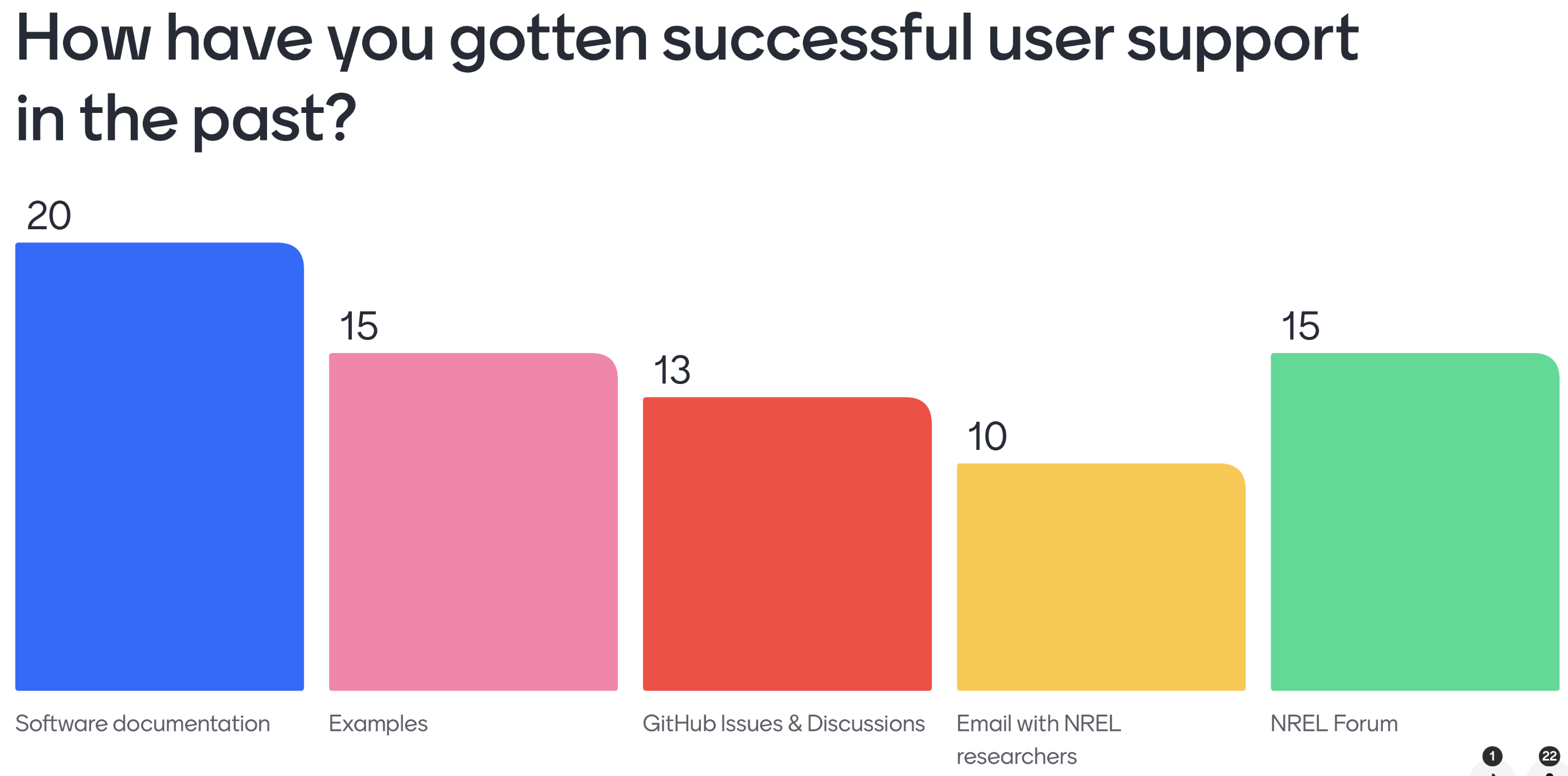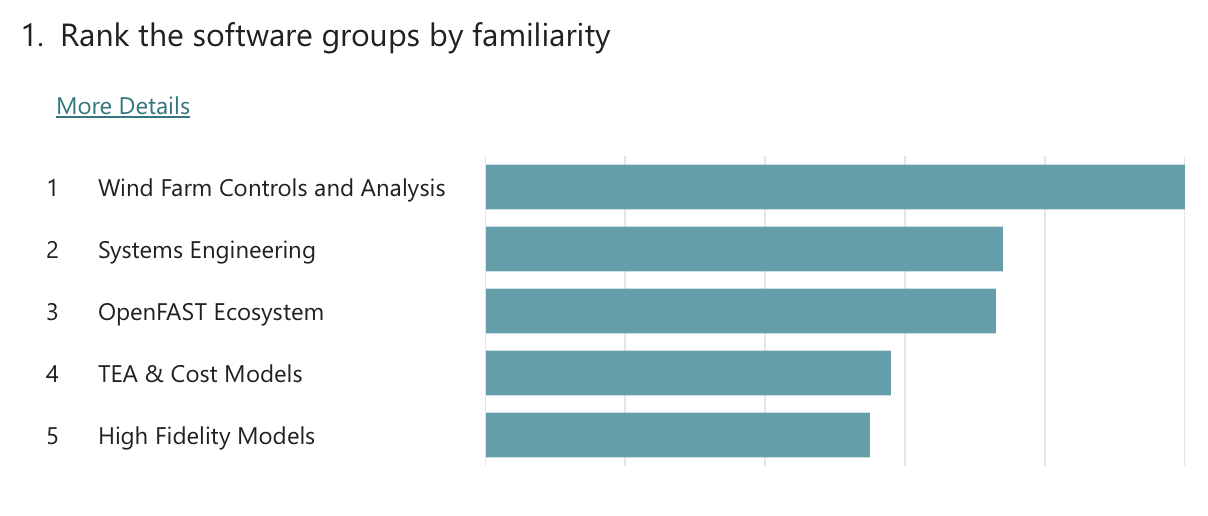 In each workshop, questions were asked about existing and future user support options. As for existing support, attendees noted that they mostly receive help from the model owners via the NREL Forums and GitHub-based forums, and that they also use the documentation and examples as a reference. On future user support, the questions asked attendees to rank support options in order of priority. The questions in each workshop were different, so a direct comparison is not made. However, respondents generally settled on the following ranking: