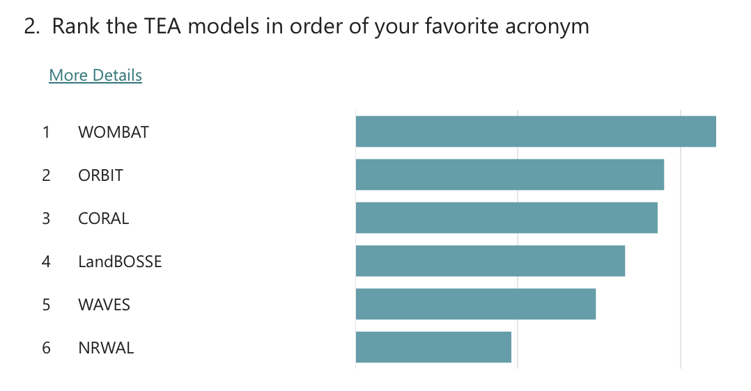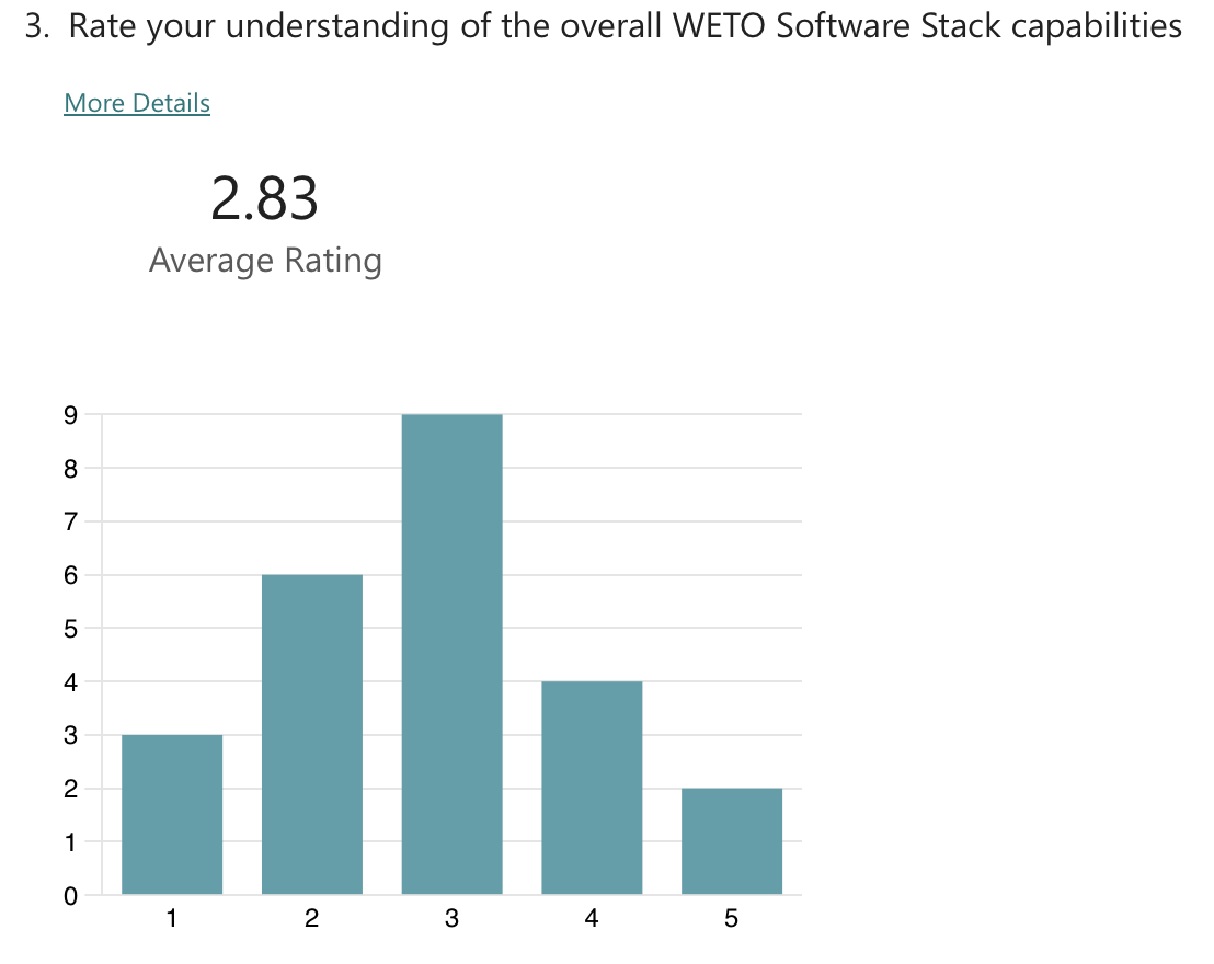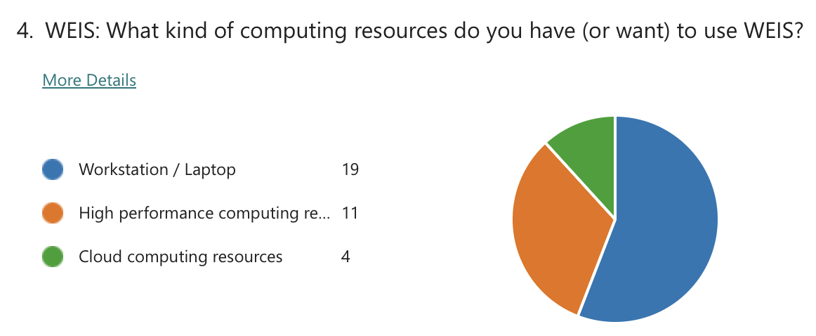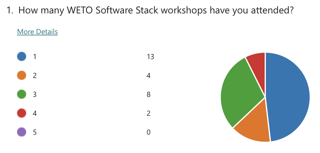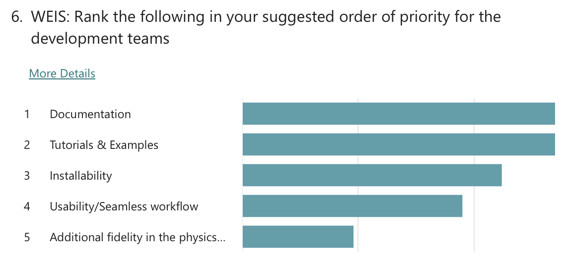 Polls were conducted to understand the community’s priorities around future development of the WETO Stack. The questions evolved throughout the series of workshops, but the results overwhelmingly indicate that the community supports focusing on usability and accessibility improvements. Specifically, “Documentation” and “Tutorials & Examples” were the clear favorite with “Installability” and “Usability / Seamless workflows” coming after.