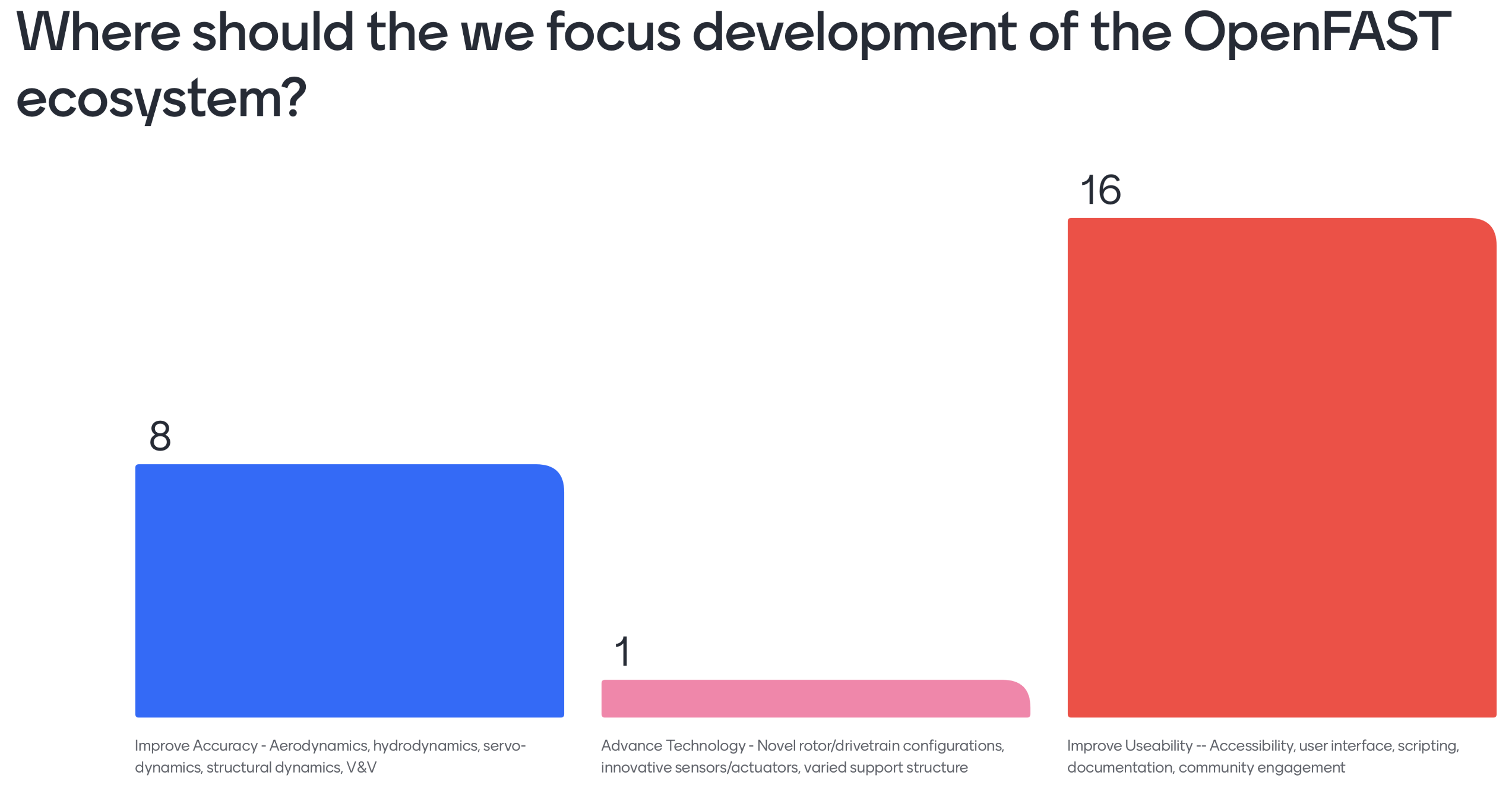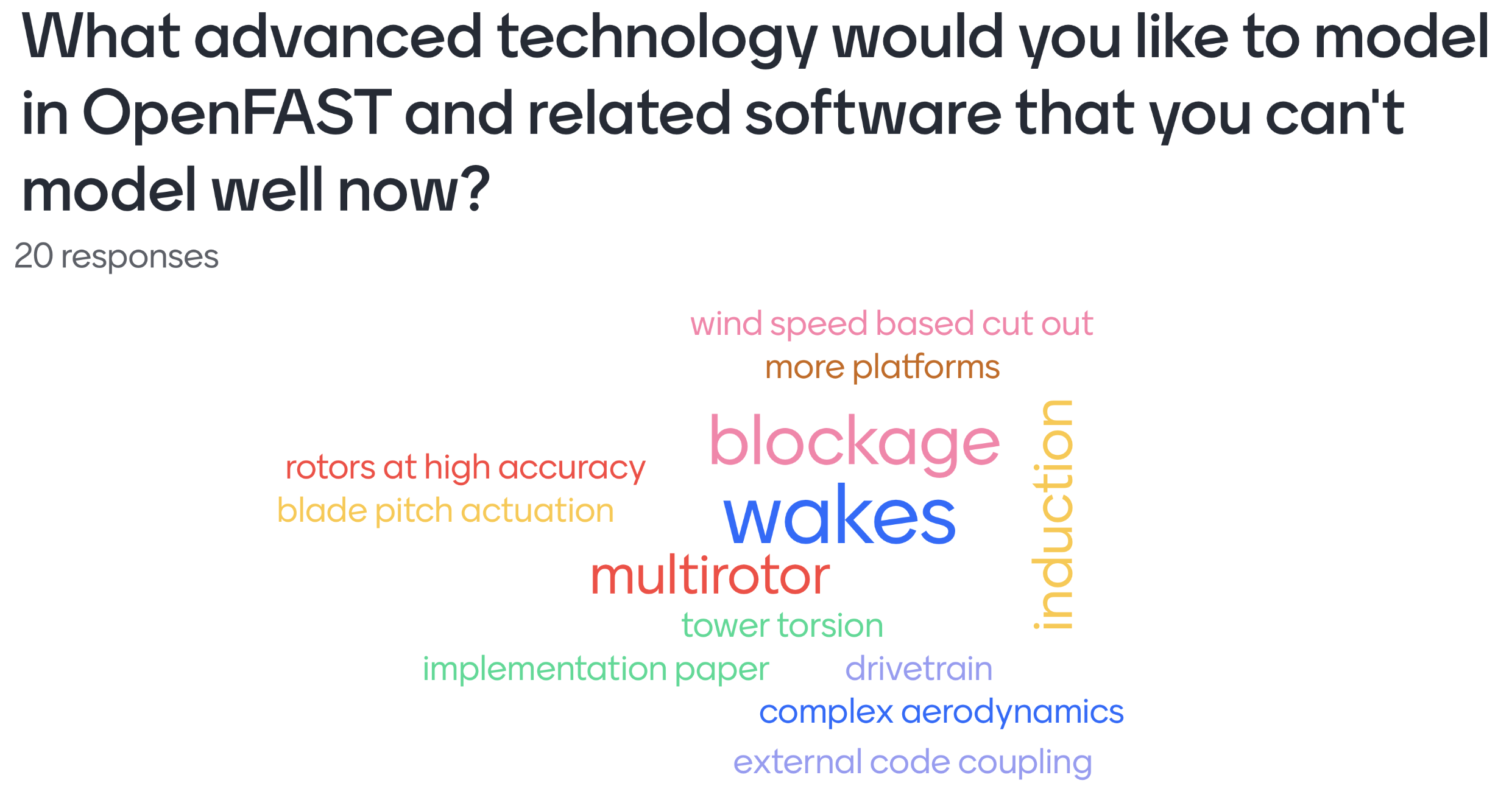 As an indicative example, a poll in the OpenFAST workshop asked attendees to write in their top priorities and displayed the answers in a word cloud. Of the 31 responses, 26 were related to accessibility issues.