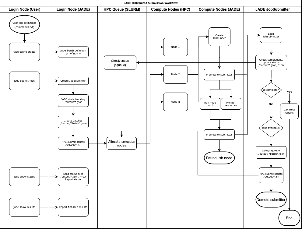 This diagram illustrates the distributed nature of JADE’s submission process. Each compute node tries to promote itself to submitter to advance the workflow. In the case where there are no blocked jobs and no pipeline this isn’t particularly interesting. The last compute node to finish its batch will generate the final reports. If there are blocked jobs or a pipeline with multiple stages then a compute node will submit newly-unblocked jobs until the entire process is complete.