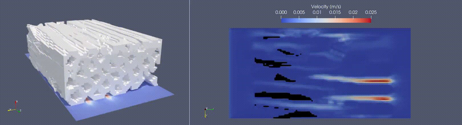 This demonstrates MARBLES ability to simulate flow through complex, porous media. An STL file, representing a section of a porous pine wood chip, obtained from an experimentally imaged 3D file,, defines the geometry for this case.
