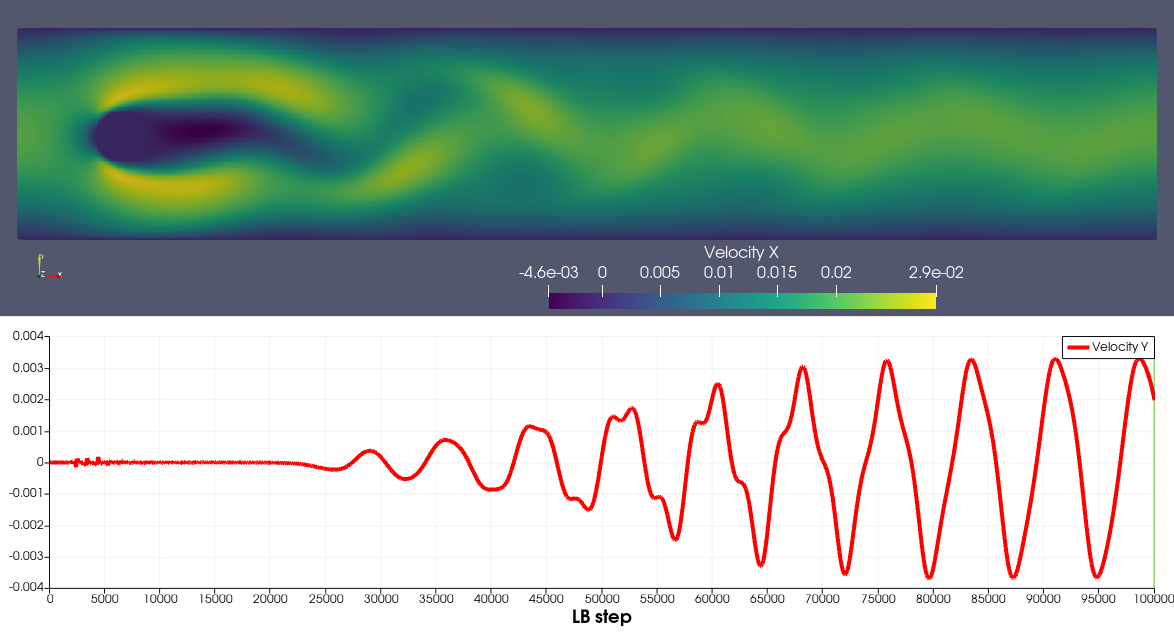 This test case solves flow around a cylinder confined in a channel and validates against the data from “Schäfer, M.; Turek, S.; Durst, F.; Krause, E.; Rannacher, R. Benchmark Computations of Laminar Flow Around a Cylinder, 1996. https://doi.org/10.1007/978-3-322-89849-4_39.” The input files included with MARBLES correspond to case 2D-2 of the “Schäfer et al.” benchmark. The Strouhal number is found to be 0.28 from the simulation, in agreement with the range from literature.