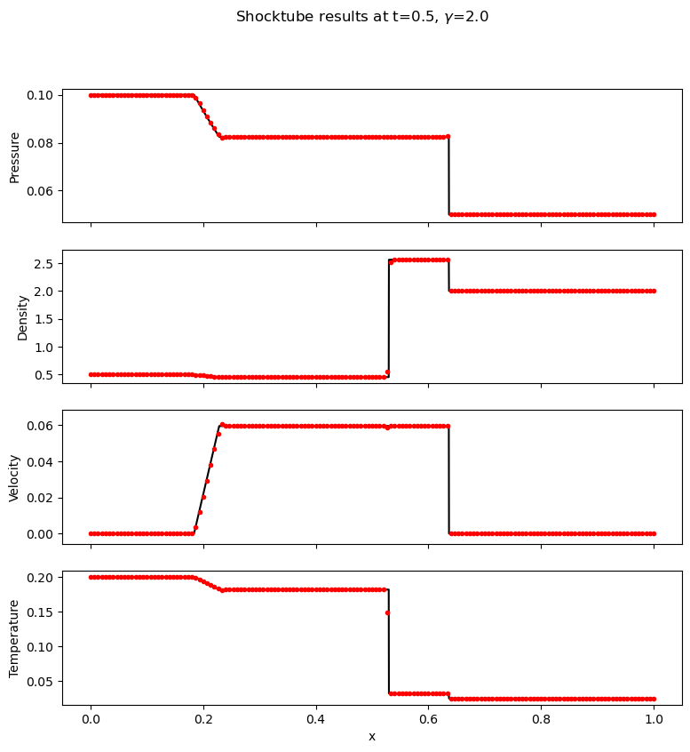 This test case demonstrates MARBLES ability to solve compressible flows with realistic parameters of practical interest. The correct position of the wave structures confirm that the speed of sound is correct in the thermal version of the solver. The model is the same as that built for the thermal diffusivity test. The sod shock test marks the completion of the MARBLES solver to the extent of a contunuum limit, single-component, single-phase, transient computational fluid dynamics solver with mass, momentum and energy equations.