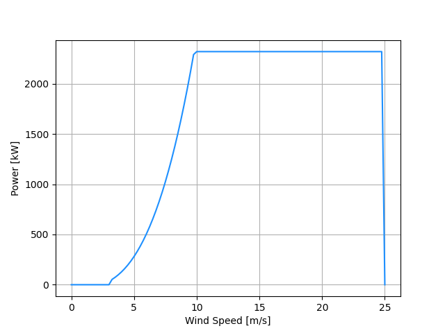 This turbine model originates from NREL’s 2017 Cost of Wind Energy Review 1 and was also used as the ‘Today’ turbine in a NREL Technical Report investigating the impact of tall towers 2.