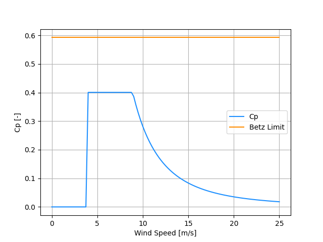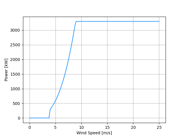 This turbine model originates from NREL’s Big Adaptive Rotor project 1 and was also used as the ‘business as usual (BAU)’ turbine in a NREL Technical Report investigating the impact of tall towers 2.