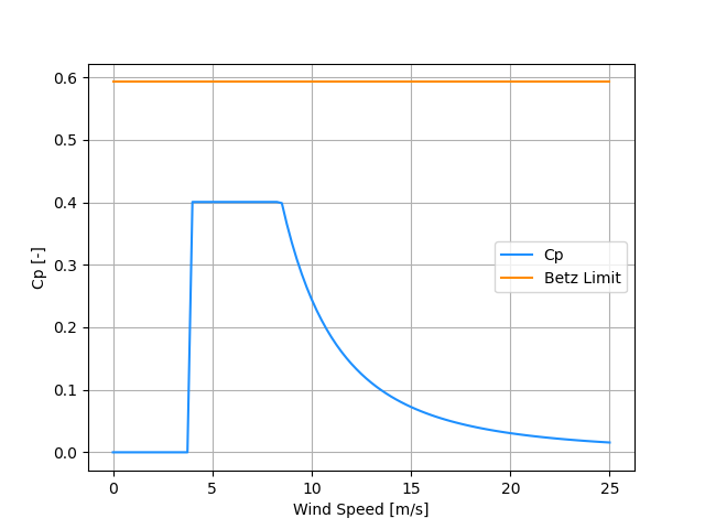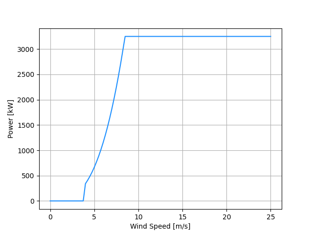 This turbine model originates from NREL’s Big Adaptive Rotor project 1 and was also used as the ‘Low-SP 3.25 MW’ turbine in a NREL Technical Report investigating the impact of tall towers 2.