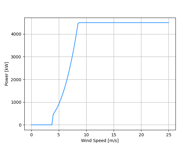 This turbine model originates from NREL’s Big Adaptive Rotor project 1 and was also used as the ‘Low-SP 4.5 MW’ turbine in a NREL Technical Report investigating the impact of tall towers 2.