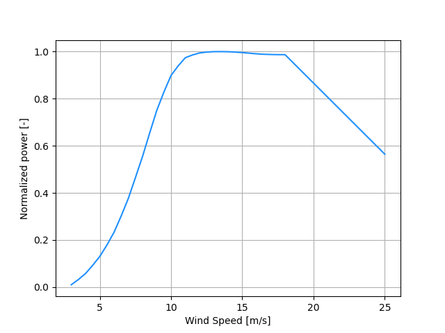 Normalized composite power curve produced by NREL with data from four commercially available onshore IEC Class II machines.