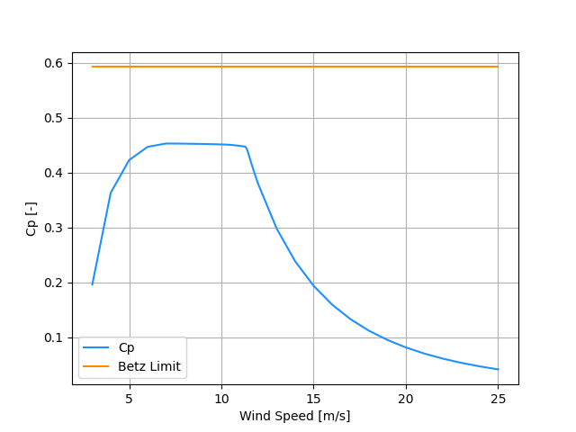 Note: (from Forum) RotThrust is axial force including some contribution from the rotor weight (not purely the aerodynamic thrust). Also, the included curves are the generator power and generator Cp. Aerodynamic power and Cp are available at the source.
