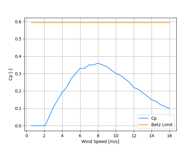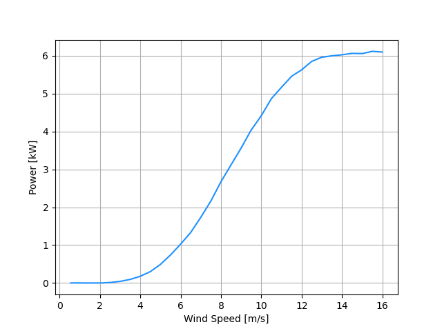 The performance data comes from a power performance test conducted by the Small Wind Certification Council (SWCC) 1. Note there seems to be a typo in the units of the power output column in this document. It reads kW but should probably be Watts based on the 6kW inverter mentioned.