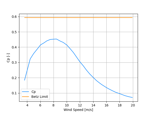 Note that Power and Cp were both measured up to 15.3 m/s as 10 min bin averages, but above this the wind speeds and power measurements are 1 min bin averages and the Cp values are calculated based on the power equation above this wind speed as they are not reported.